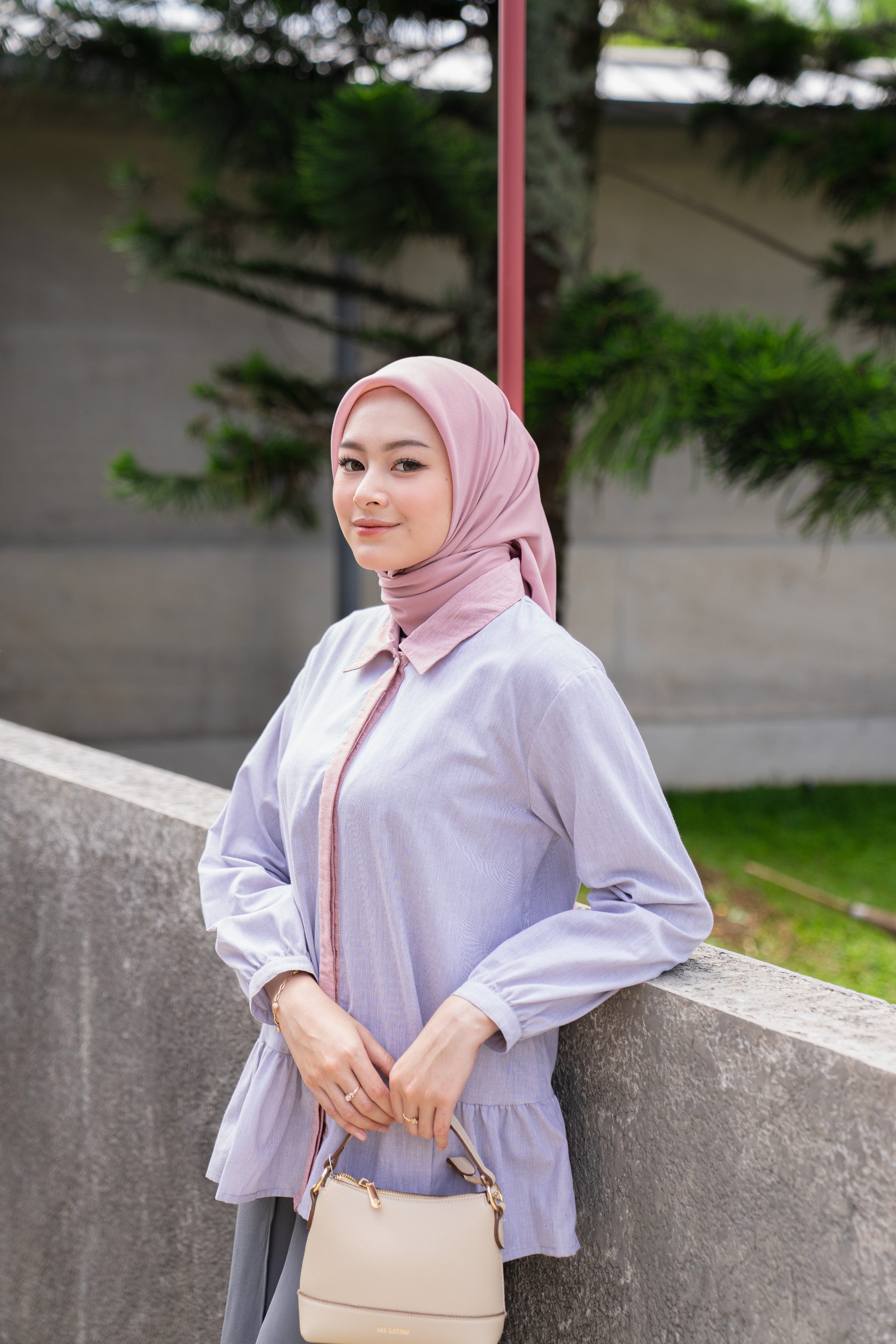 Dibuat menggunakan material Haruka Cotton. Karakteristik bahan ringan, flowy dan adem. Kemeja model two tone dengan motif kotak-kotak super kecil dengan aksen kancing cantik pada kerah, dan kancing sembunyi pada bagian depan. Terdapat kancing pada bagian manset tangan, wudhu friendly.