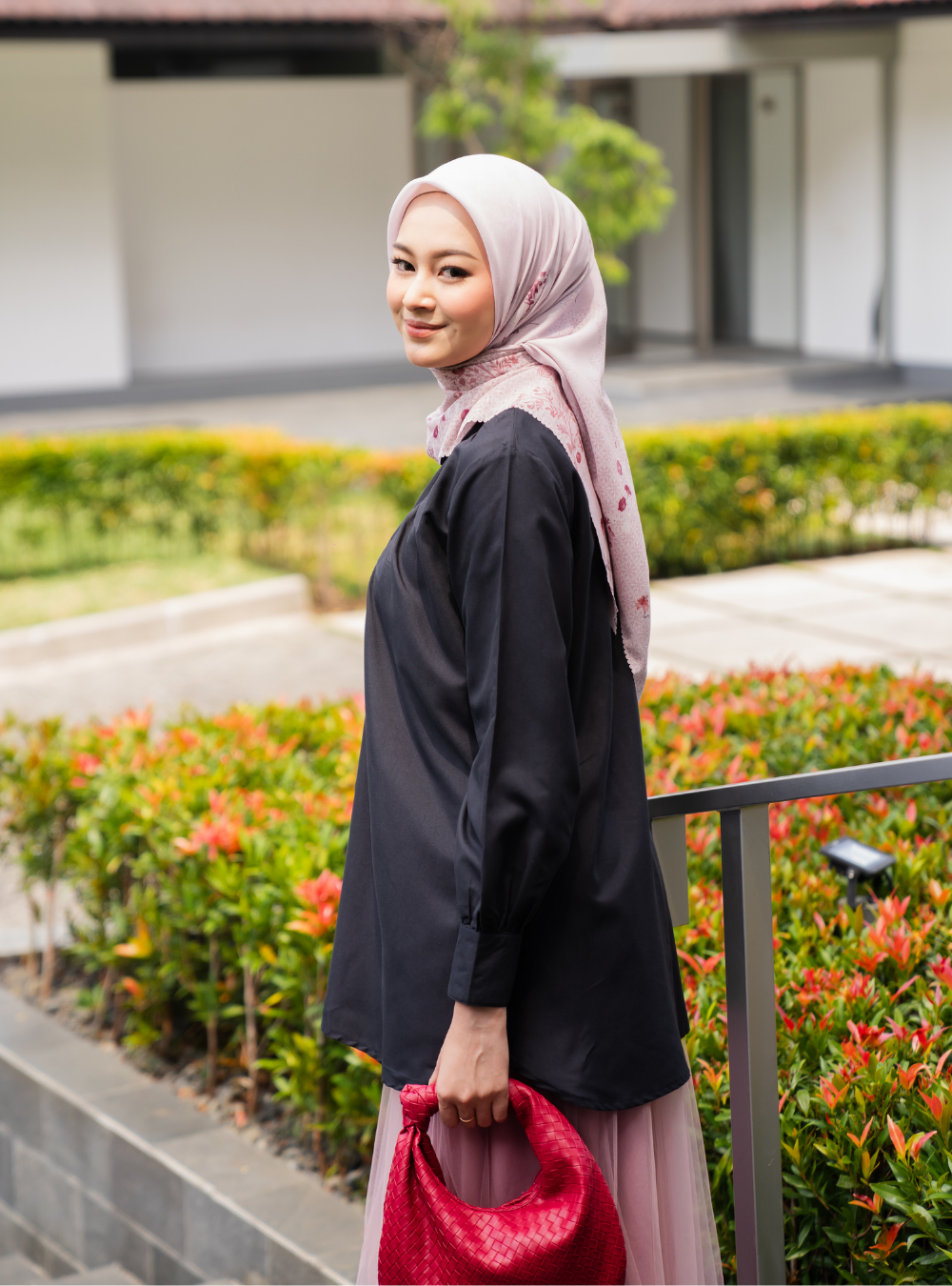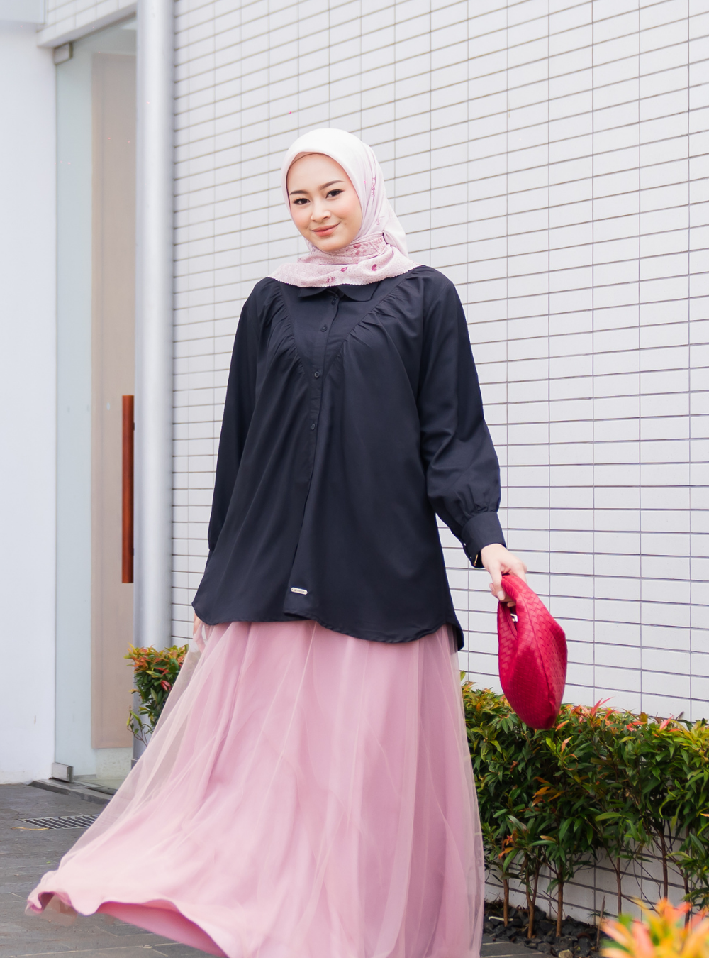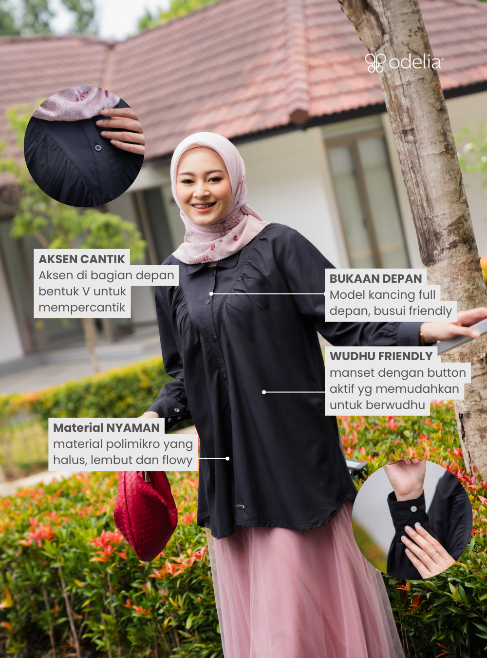 Dibuat menggunanakan material yang halus, lembut dan flowy. Didesain dengan model model kancing full depan, sehingga busui friendly. Terdapat aksen bentuk V di bagian depan untuk mempercantik dan kancing aktif di bagian pergelangan, wudhu friendly.