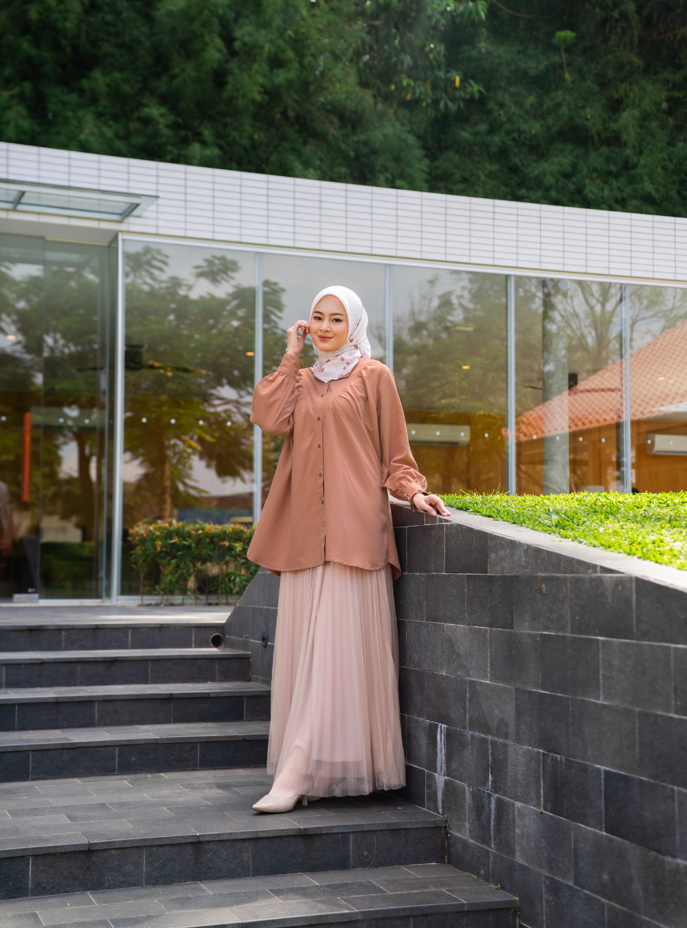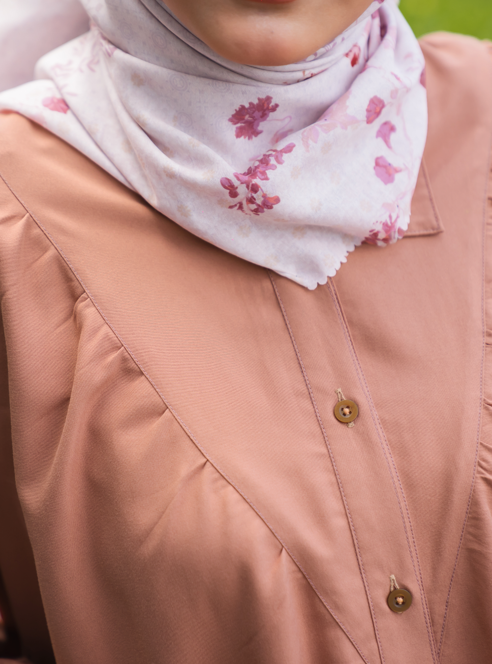 Dibuat menggunanakan material yang halus, lembut dan flowy. Didesain dengan model model kancing full depan, sehingga busui friendly. Terdapat aksen bentuk V di bagian depan untuk mempercantik dan kancing aktif di bagian pergelangan, wudhu friendly.