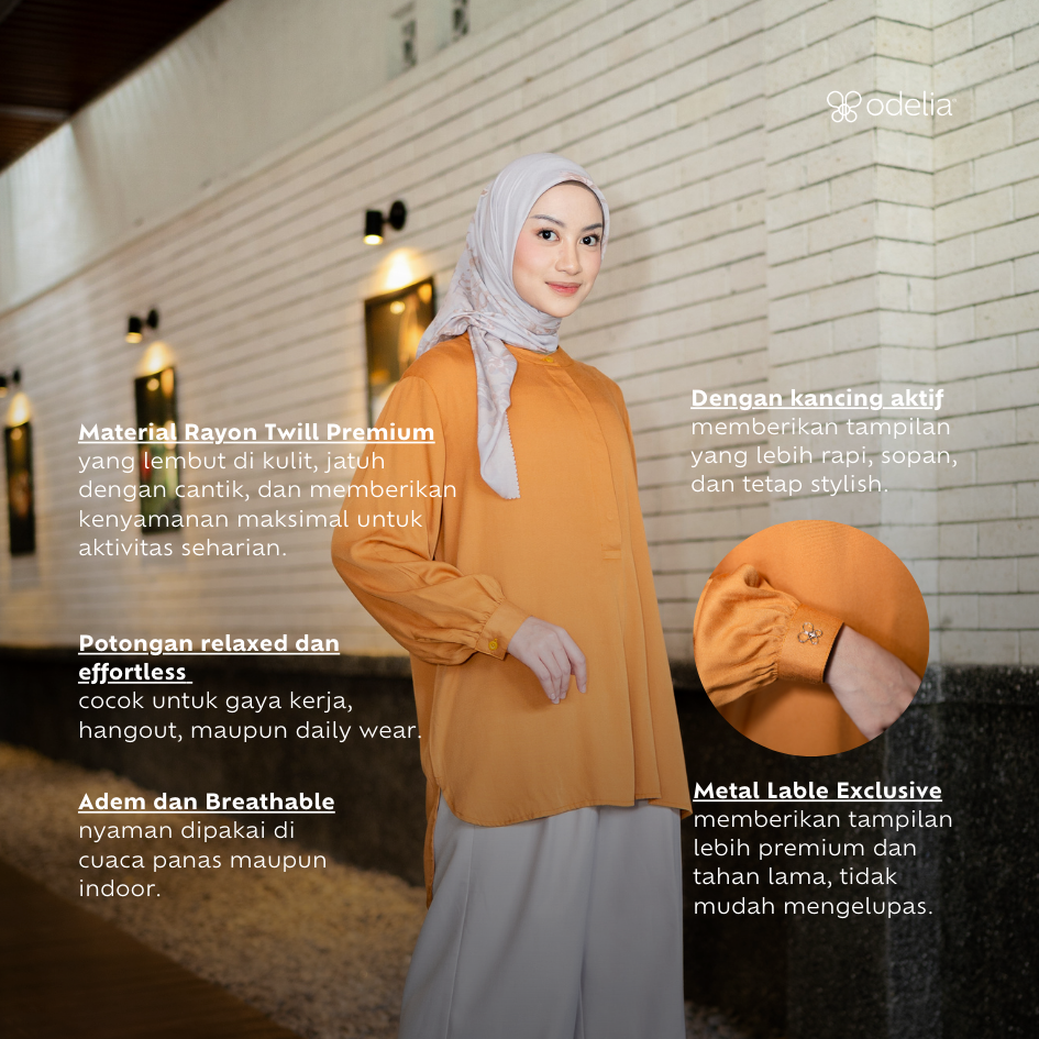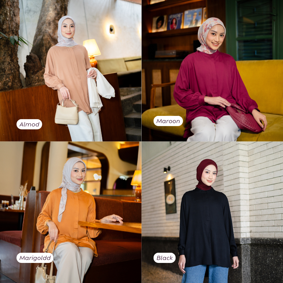 Didesain dengan kancing aktif di bagian depan setengah badan yang menciptakan kesan sopan, clean, dan tetap stylish. Dilengkapi manset lengan berkancing yang wudhu friendly, memudahkan saat beraktivitas tanpa perlu menggulung lengan. Siluetnya yang ringan dan jatuh cantik menjadikan blouse ini pilihan tepat untuk tampilan kerja, hangout, hingga daily wear.
