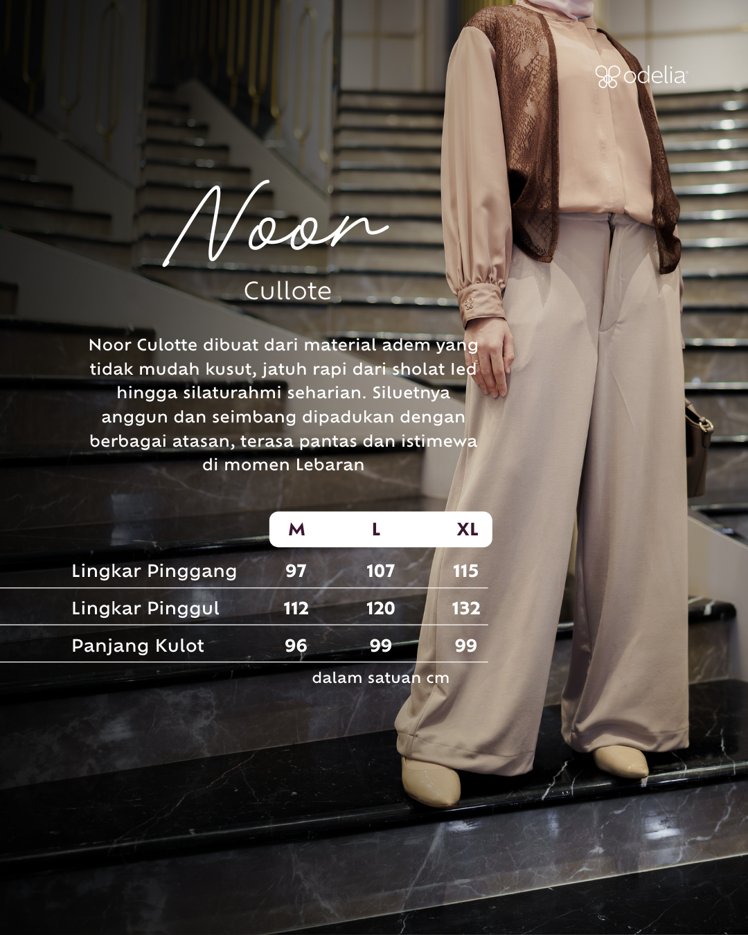 Mudah dipadupadankan dengan blouse, tunik, maupun outer dari seri Noor, kulot ini memberi tampilan rapi dan elegan tanpa terasa terlalu formal—tepat untuk momen spesial maupun penggunaan harian.