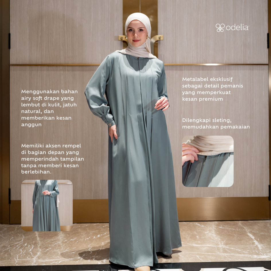 Dilengkapi metalabel eksklusif sebagai detail pemanis yang memperkuat kesan premium. Manset lengan dengan kancing memudahkan saat berwudhu tanpa mengurangi kerapian tampilan. Terdapat sleting untuk memudahkan pemakaian serta tali tambahan yang dapat digunakan di bagian pinggang untuk menyesuaikan siluet sesuai preferensi.