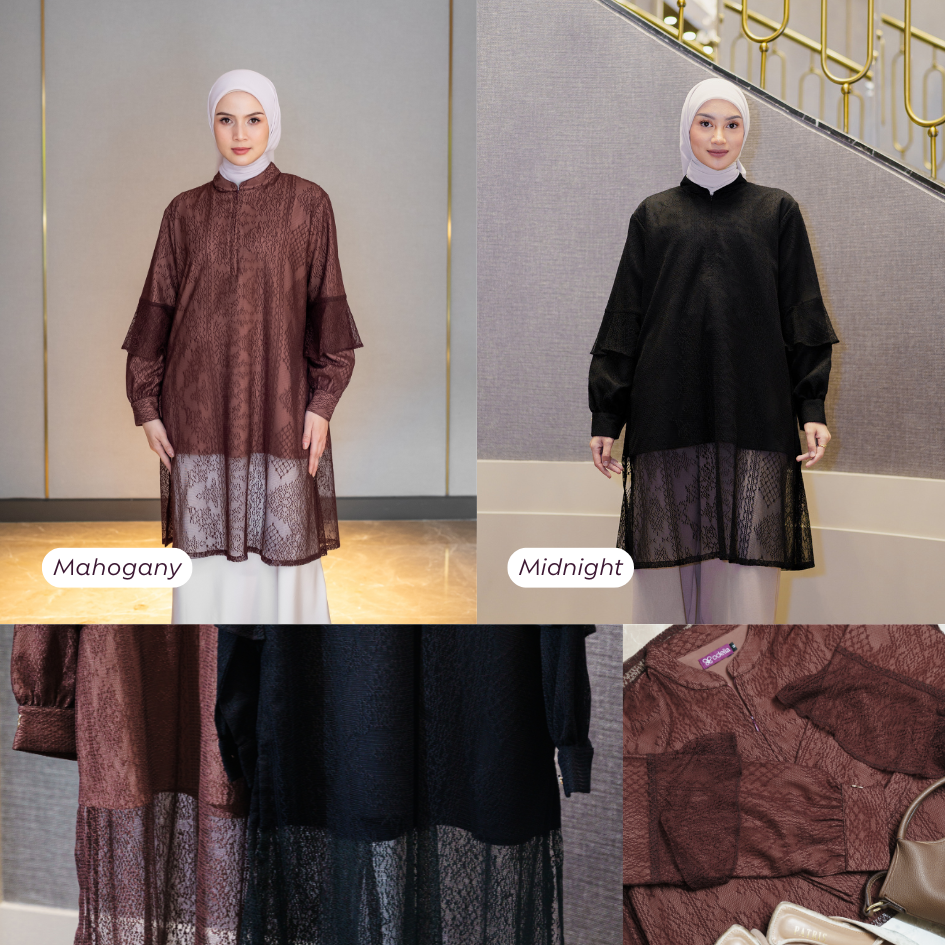 Struktur tunik dirancang jatuh rapi mengikuti tubuh, membuat lace terlihat ringan dan anggun, bukan berat atau terlalu ramai. Siluetnya membantu menciptakan tampilan yang lebih seimbang dan flattering pada berbagai bentuk badan.