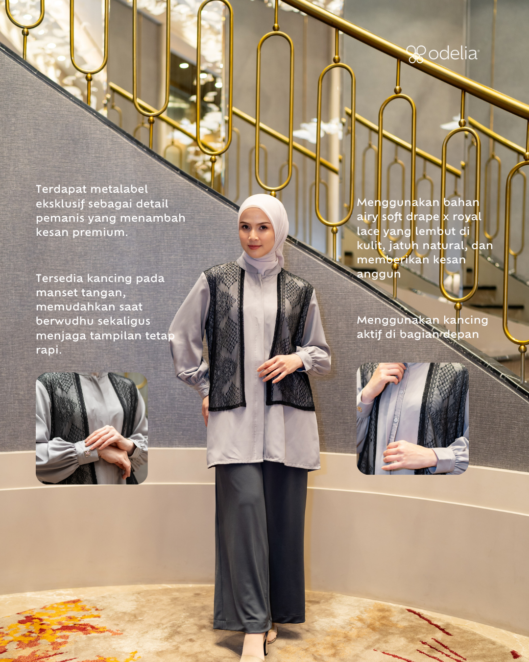 Materialnya ringan dan breathable, nyaman dikenakan seharian, termasuk saat beraktivitas di hari Lebaran. Potongan blouse dibuat lebih panjang dan proporsional, memberikan siluet yang rapi sekaligus rasa aman saat bergerak, beribadah, bersalaman, dan bersilaturahmi.