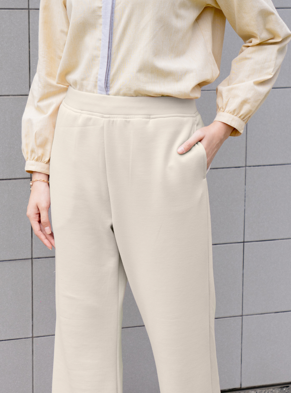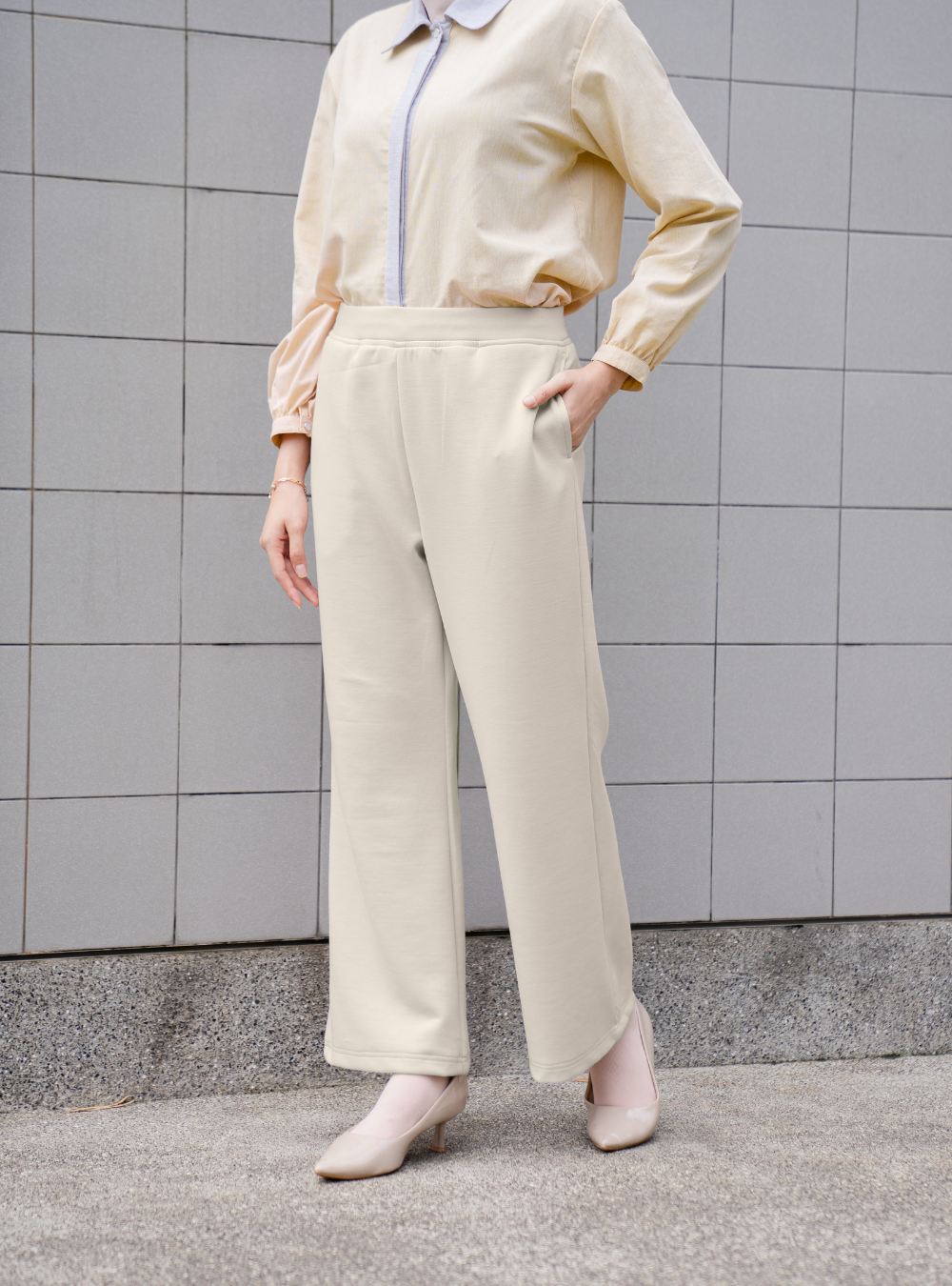 dibuat menggunakan material Nisseko Knit. Karakteristik bahan tebal dan flowy. Di bagian pinggang menggunakan karet dan tali sehingga strechy. Ada saku di bagian kanan dan kiri. Style celana ini adalah kulot sehingga longgar di bagian kaki dan bisa menyembunyikan betis yang kurang indah.