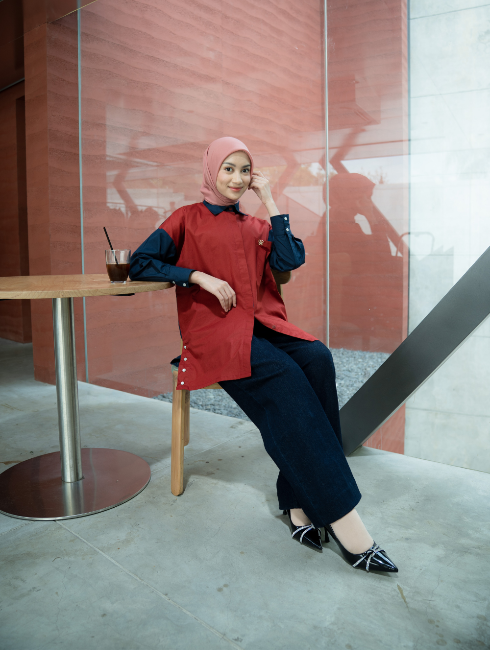 Didesain dengan bentuk kerah klasik dan bukaan kancing depan full aktif (busui friendly) dan tersembunyi menambah kesan yang rapi, serta manset berlengan kancing (wudhu friendly) yang adjustable yang dapat disesuaikan dengan ukuran lengan. Potongan oversize memberikan kenyamanan ekstra dan membantu menyamarkan bentuk tubuh, tetap tampak sopan dan stylish.
